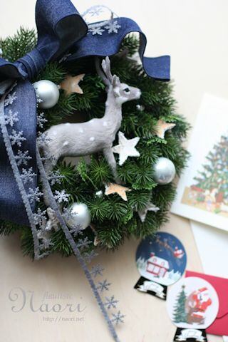 トナカイの飾りを中央に飾った、とてもクリスマスらしいリースです。