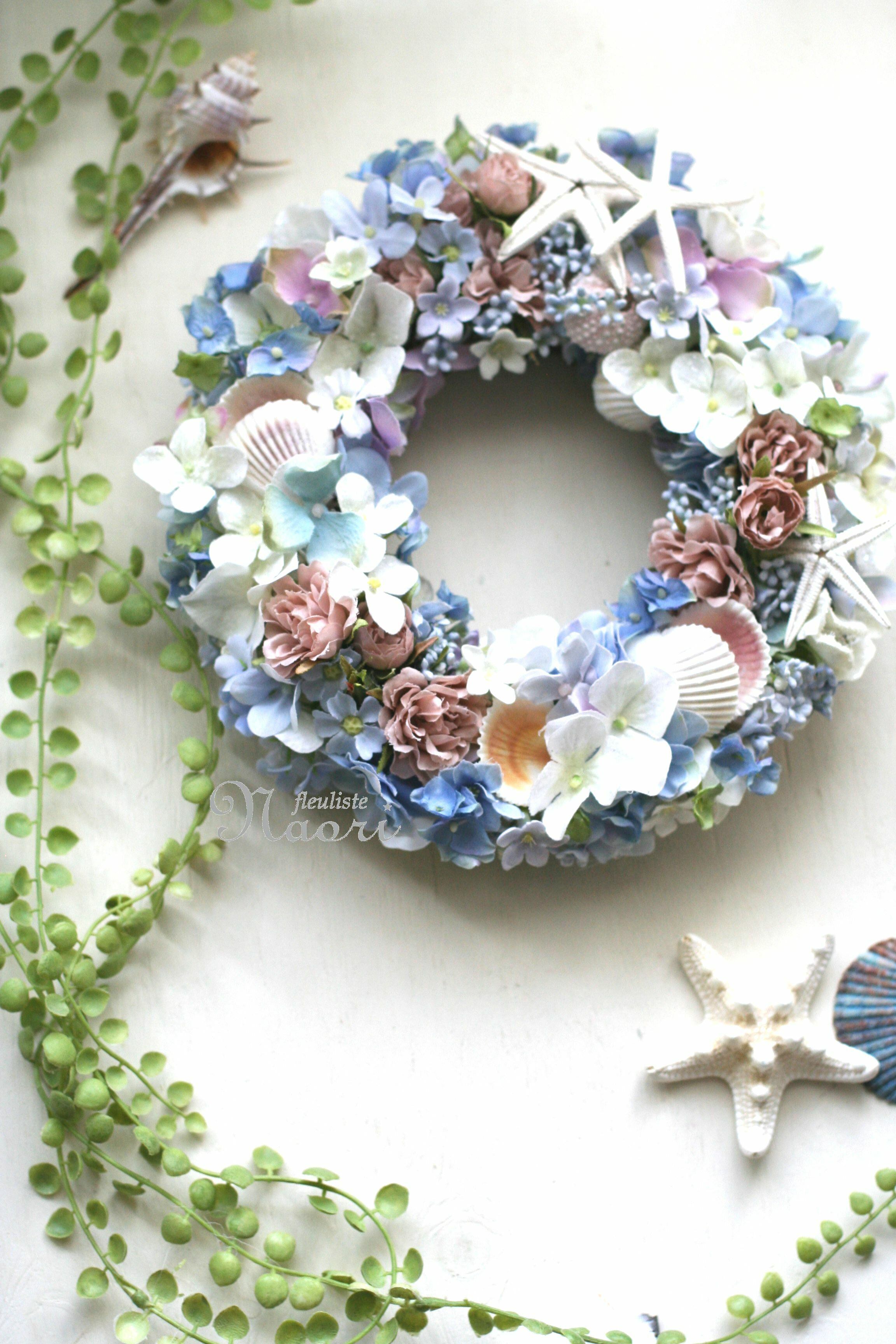 ブルーのお花やみずみずしい白いお花でアレンジした優しいカラーのシェルリースです。