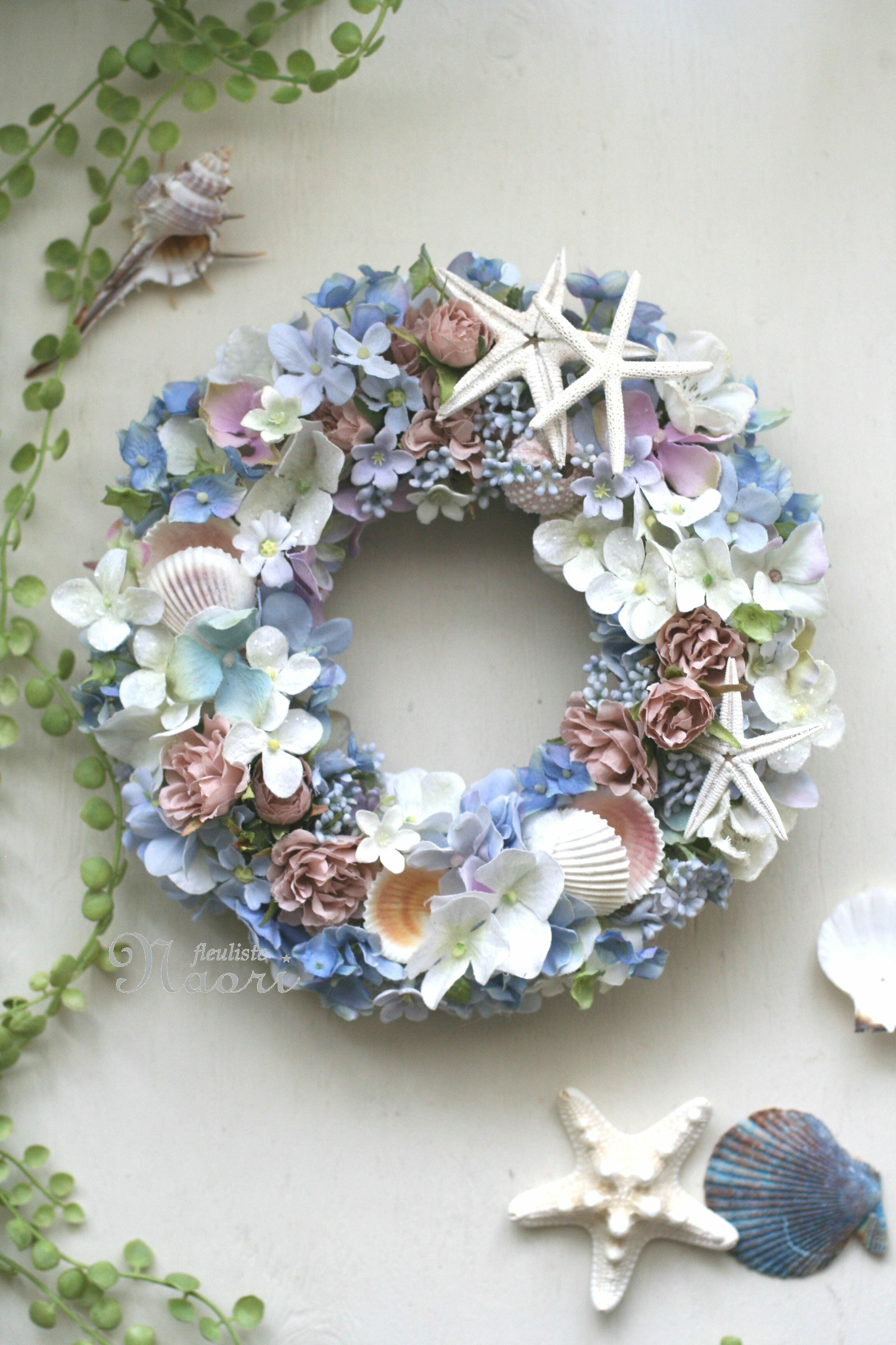 貝殻とヒトデのリース 紫陽花とローズ sea19-1
