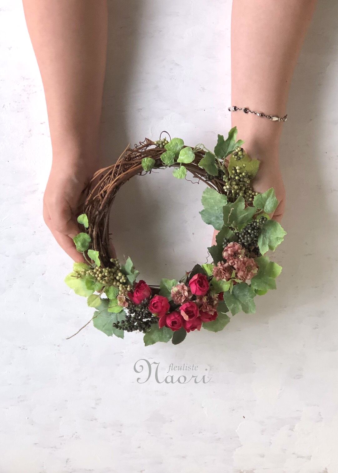 美しい蔦の葉に、実物やバラをアレンジしてナチュラルに仕上げました。